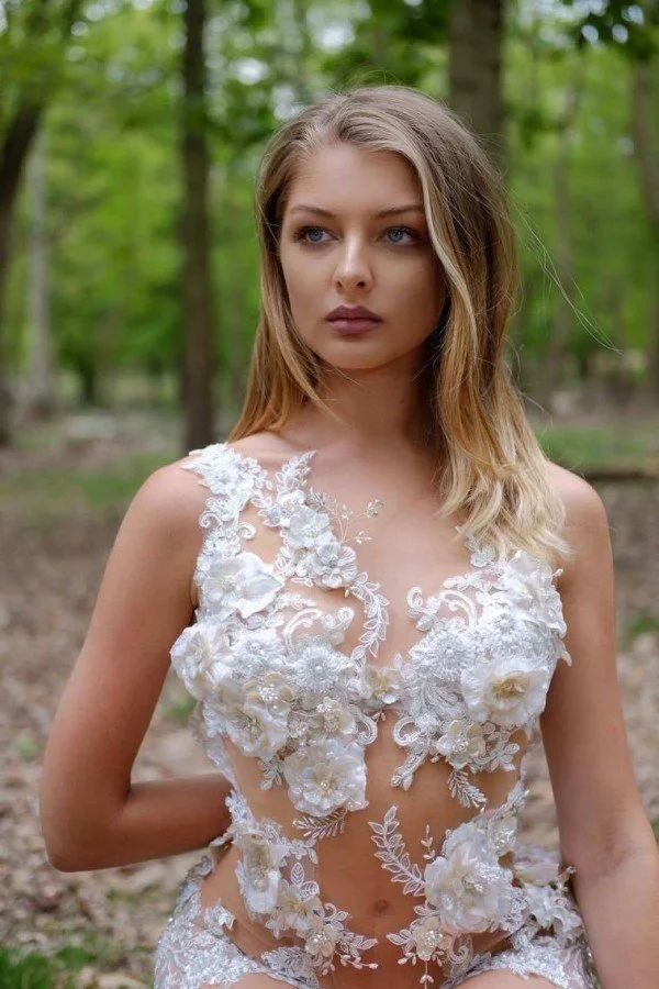 All the materials I use I hand source to ensure quality and gauge if they will be suitable for intimate wear. I work with a lot of lace, sometimes deconstructing vintage garments if I find a little something too exquisite to imitate through modern methods. The embellishments are created using a variety of freshwater pearls and Swarovski crystals, plus any other exciting bits and pieces I can find. My absolute essential is invisible tulle, as you can create some really enchanting effects that just seem to melt into the skin.